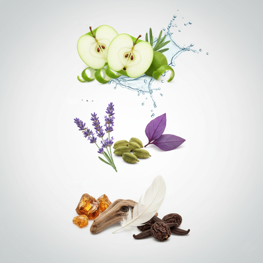 It opens bright and airy — green apple and bergamot sparkle against a watery accord, keeping things crisp yet soft. The heart unfolds with cardamom and lavender, adding just enough warmth to feel personal without ever being heavy.